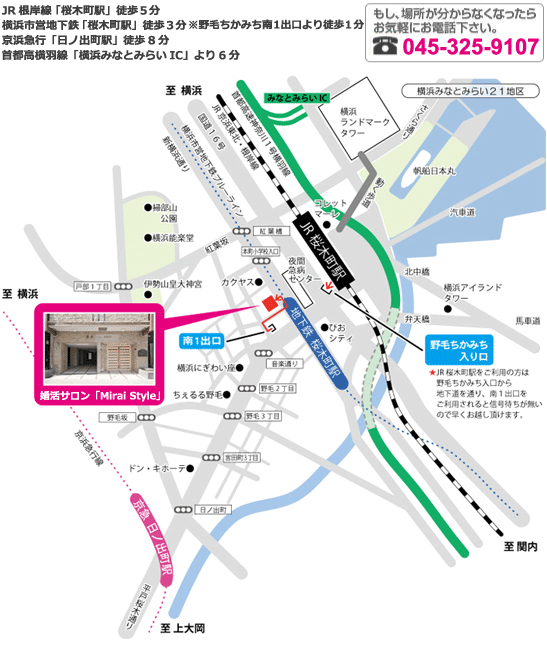 Mirai Styleトップ > 会社概要 > アクセスマップ アクセスマップ ◆所在地 〒231-0063 神奈川県横浜市中区花咲町2-66-3 アール・ケープラザ横濱Ⅵ 201号室 ◆電車でお越しの場合 JR根岸線:桜木町駅徒歩5分 横浜市営地下鉄:桜木町駅徒歩3分 ※野毛ちかみち南1出口より徒歩1分 ◆お車でお越しの場合 首都高横羽線「横浜みなとみらいIC」より6分 (※付近にコインパーキングがございます) 会社概要 メニュー ・会社概要TOP ・代表 高橋知子の思い ・アクセスマップ ・プライバシーポリシー ・利用規約 初回カウンセリング(無料)予約はこちら